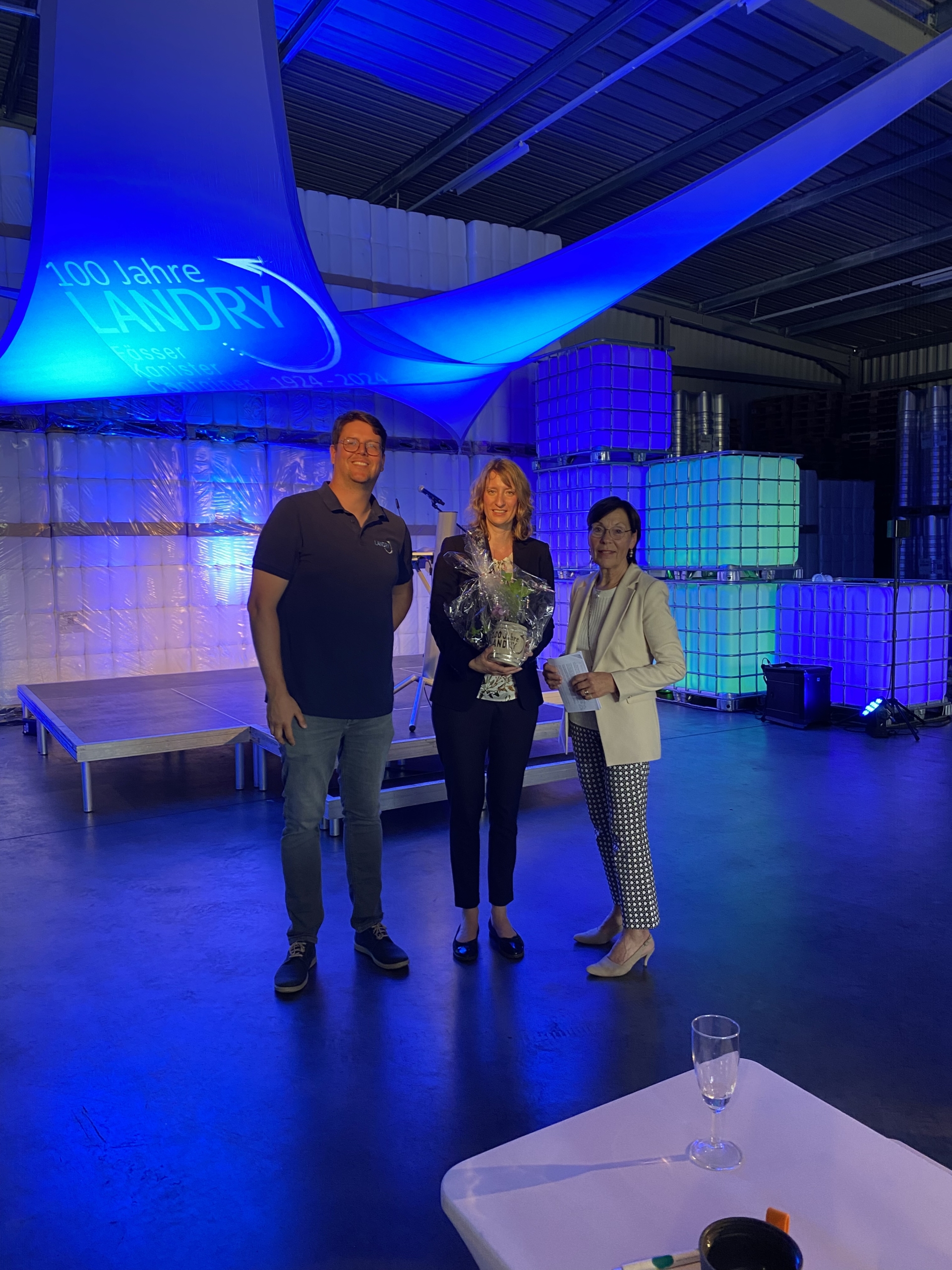 „100 Jahre ist eine besondere Geschichte, eine Erfolgsgeschichte, eine Familiengeschichte. Ohne Fleiß, ohne harte Arbeit, ohne große Anstrengungen, ohne all das würde es dieses Familienunternehmen nicht geben! Begonnen hat alles mit dem Reinigen von Weinfässern. Heute sind es Fässer, Kanister und Container. Dabei wird Nachhaltigkeit ganz groß geschrieben: PV auf den Dächern, Wiederaufbereitungsanlagen für das Wasser, Energieeffiziente Dampfkessel. Als Familie haben Sie in den letzten 100 Jahre ihr Unternehmen immer top für die Zukunft aufgestellt. Damit die Familiengeschichte für die nächsten 100 Jahre fortgeschrieben werden kann, gibt es von mir ein Kalligrafie-Set in einem Fässchen. 😉“