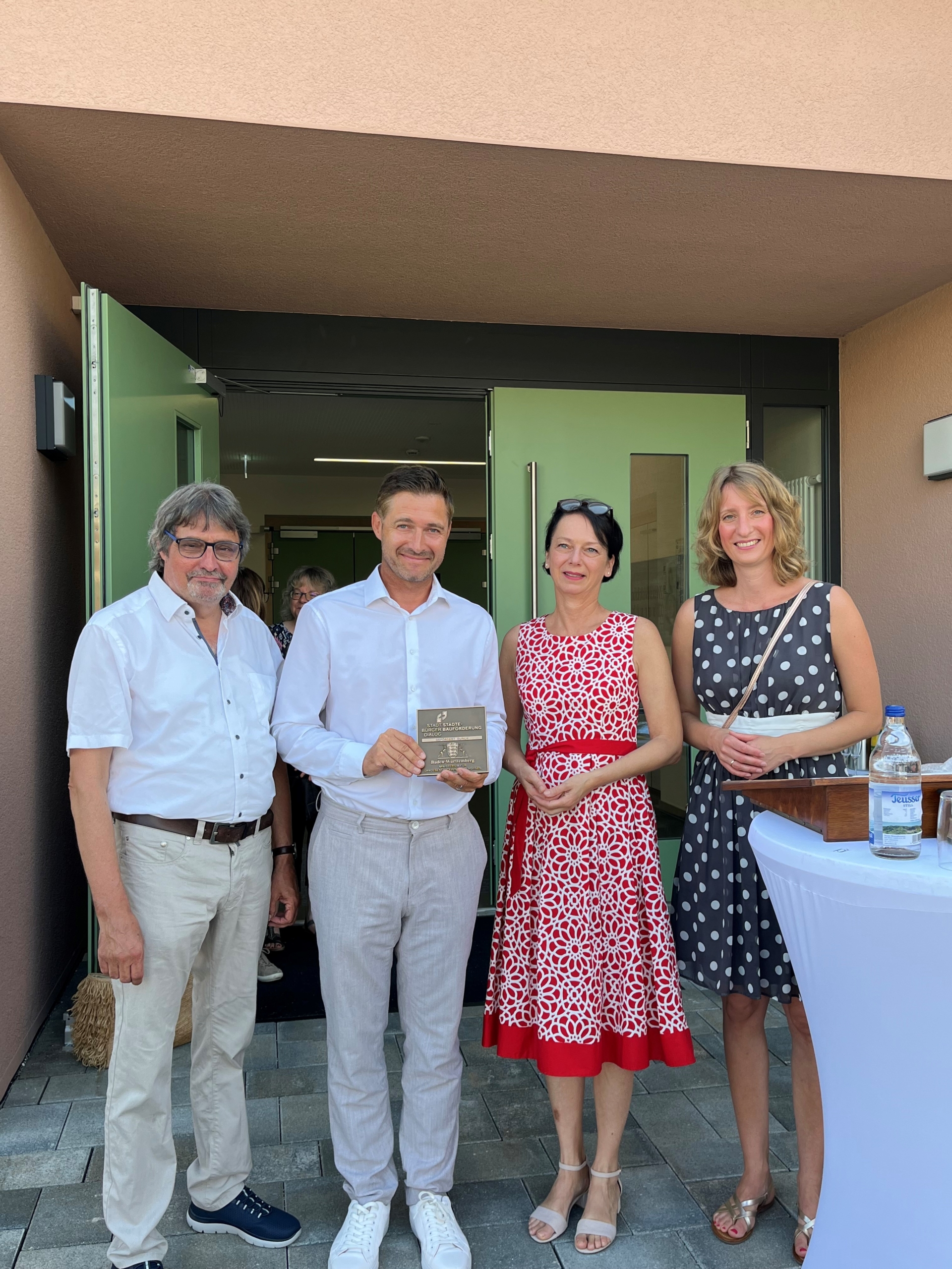 Regierungspräsidentin Susanne Bay hat heute (Dienstag, 13. August 2024) Bürgermeister Björn Steinbach für das neu errichtete Michelbachhaus in der Gemeinde Obersulm eine Bronzeplakette des Landes Baden-Württemberg übergeben. Ausgezeichnet wird mit dem Michelbachhaus ein außergewöhnliches Gebäude, das Sport, Musik und Bildung unter einem Dach vereint. Mit der Bronzeplakette des Landes werden besonders herausragende Projekte der Städtebauförderung ausgezeichnet.