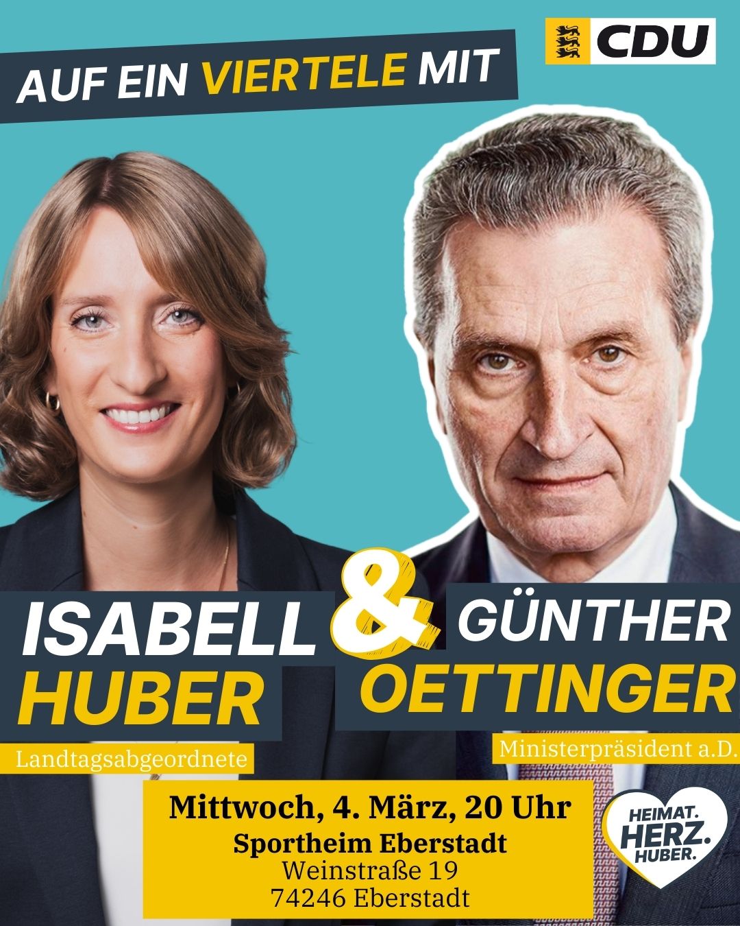 Auf meine Einladung kommt Günther H. Oettinger, Ministerpräsident a.D. und langjähriger Spitzenpolitiker, in den Wahlkreis Neckarsulm. Dazu lade ich Sie herzlich zu einer Abendveranstaltung ein – offen, persönlich und im direkten Gespräch.